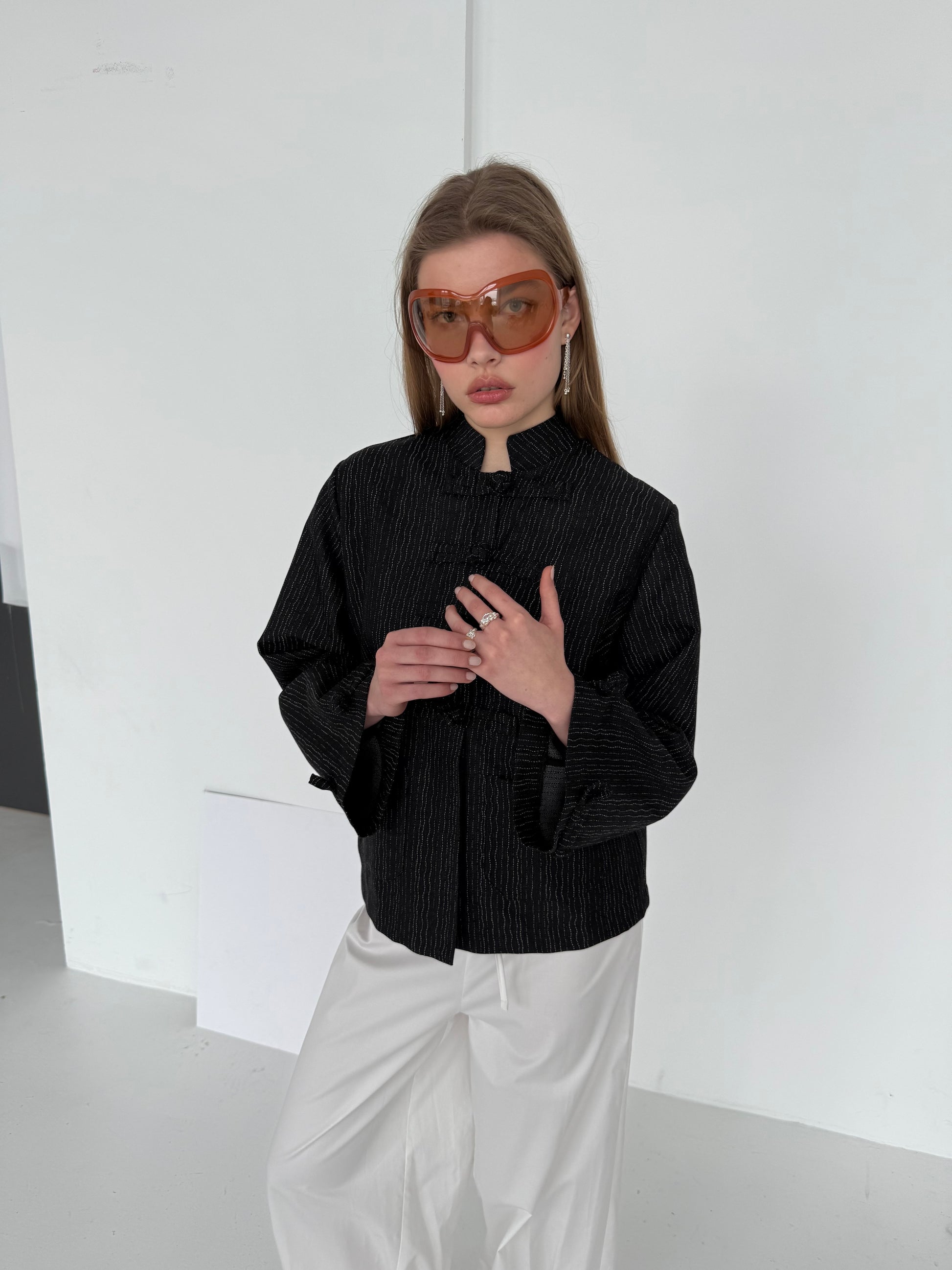 Yuki to lekka kurtka, która idealnie sprawdzi się również w roli marynarki. Ręcznie robione szamerunki na froncie i mankietach, dwie kieszenie oraz stójka to detale, które nadają całości charakter. Szamerunki na mankietach pozwalają na zwężenie rękawa i tym samym nadanie mu zupełnie innego kształtu. Uszyta z tkaniny o składzie 82% bawełna, 18% wełna, trzymająca kształt, z wyraźną strukturą i metalicznymi przeszyciami.
