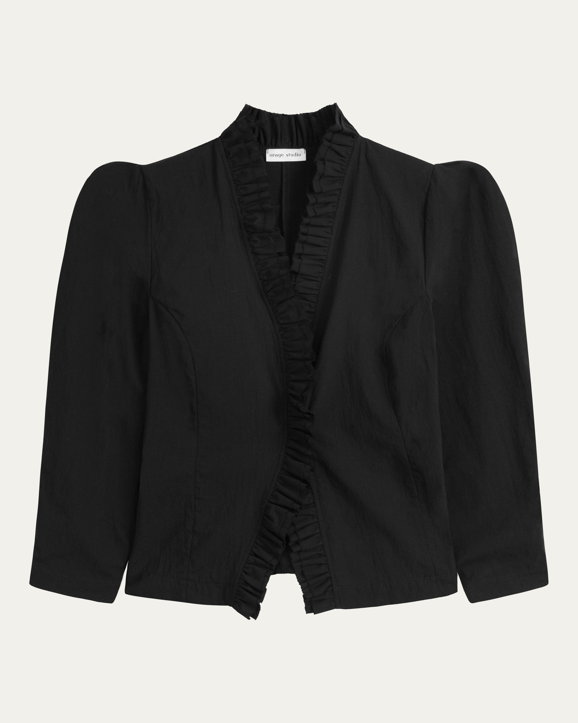 Crinkled to taliowana koszula z dużymi rękawami, które kształtem przypominają dwie połowy serca. Zapinana na dyskretny guzik wewnątrz. Gnieciona tkanina w postaci falbanek.