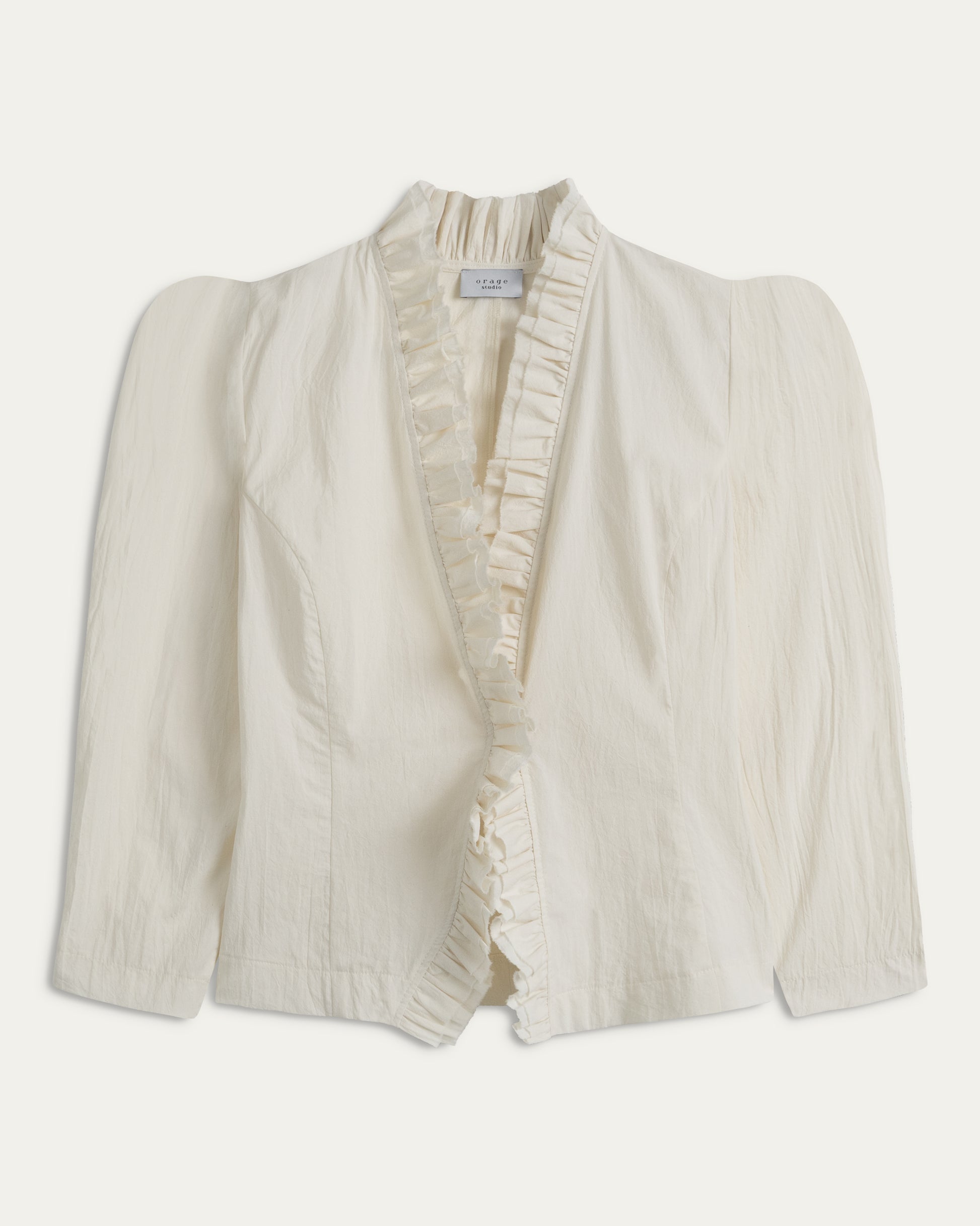 Crinkled to taliowana koszula z dużymi rękawami, które kształtem przypominają dwie połowy serca. Zapinana na dyskretny guzik wewnątrz. Gnieciona tkanina w postaci falbanek.