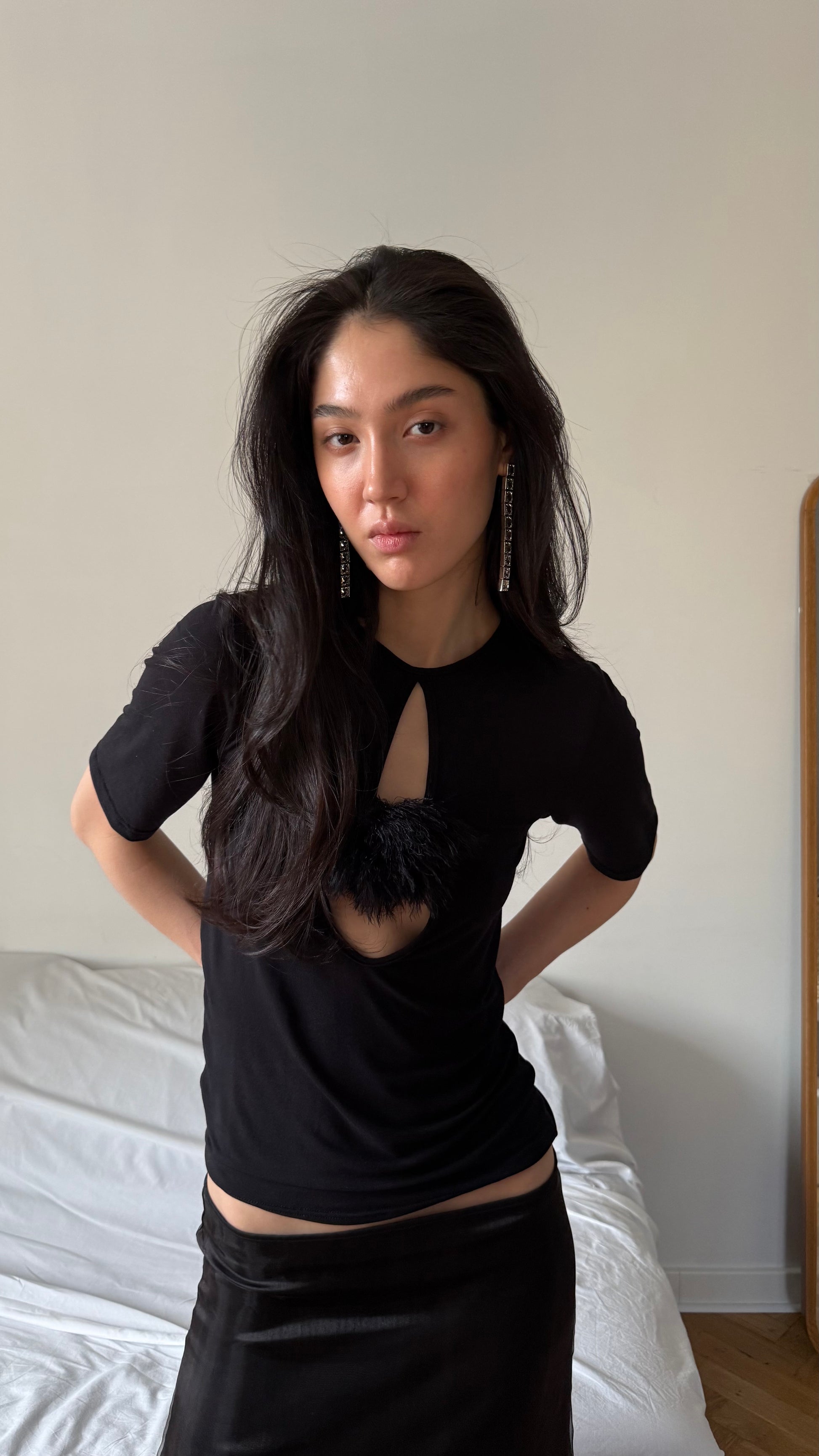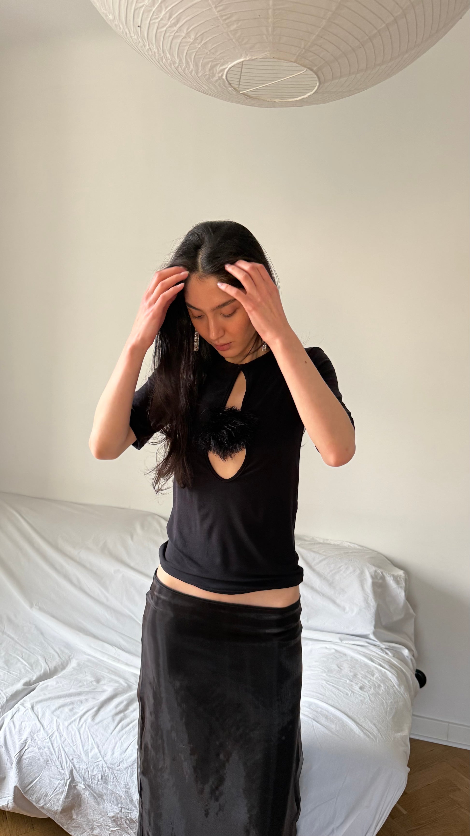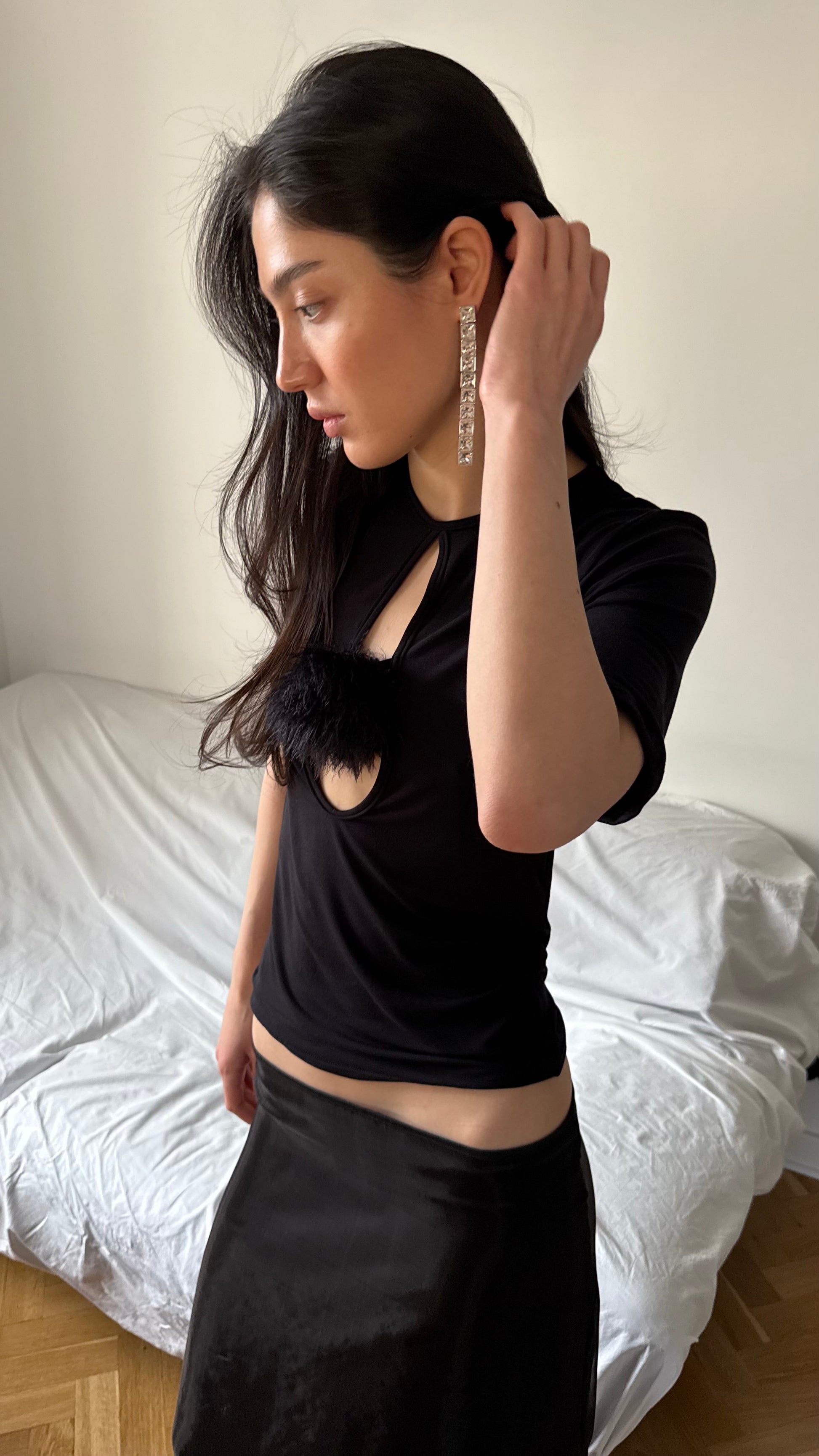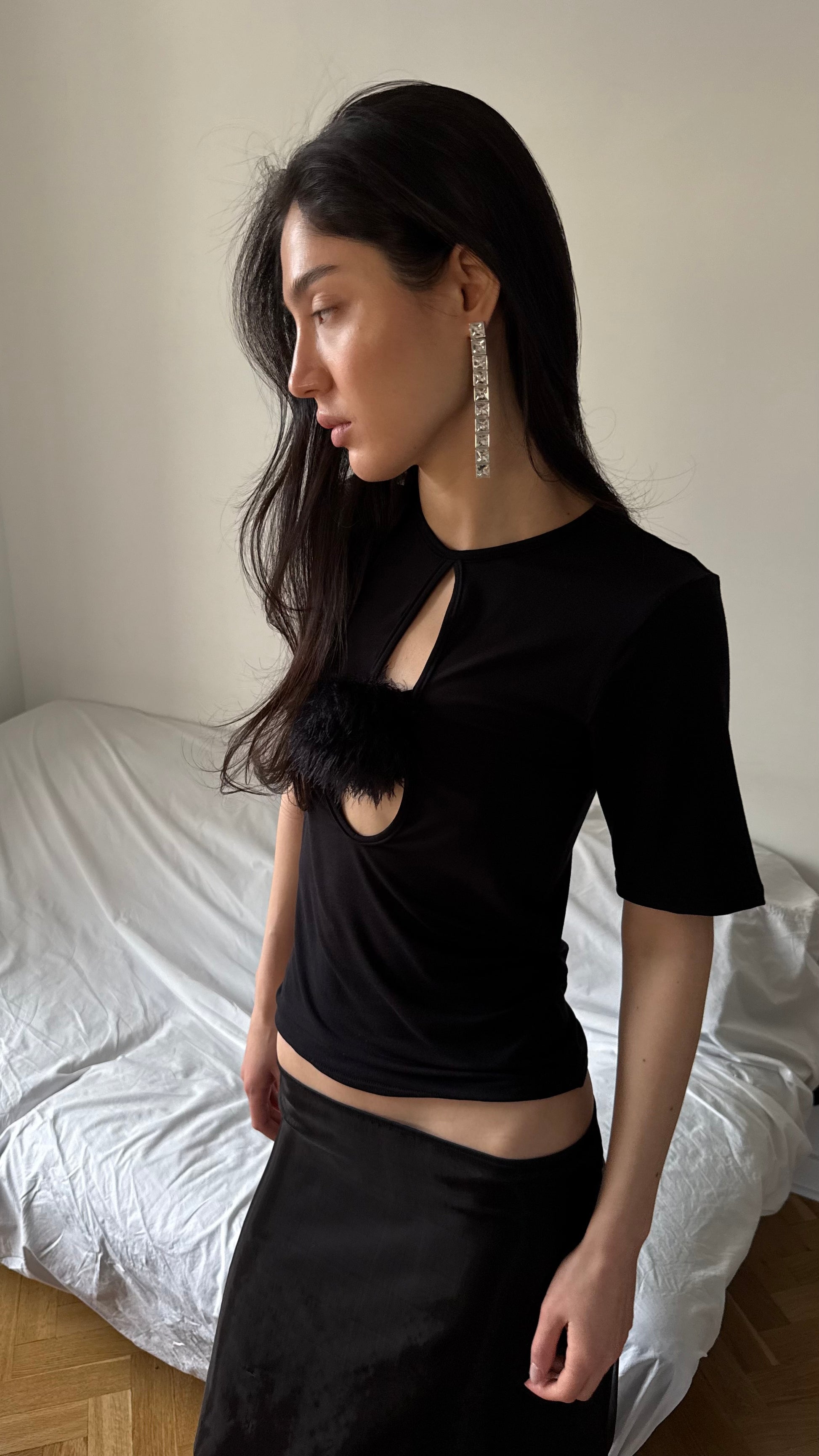 Top Sigrid to efektowna a zarazem bardzo comfy propozycja. Uszyta z miękkiej dzianiny, idealnie dopasowuje się do ciała, a przez wycięcie w dekolcie i futrzany pompon tworzy elegancki look. Pompon pełni rolę broszki jest całkowicie odpinany, więc można nosić go z topem albo przypiąć do dowolnej stylizacji.