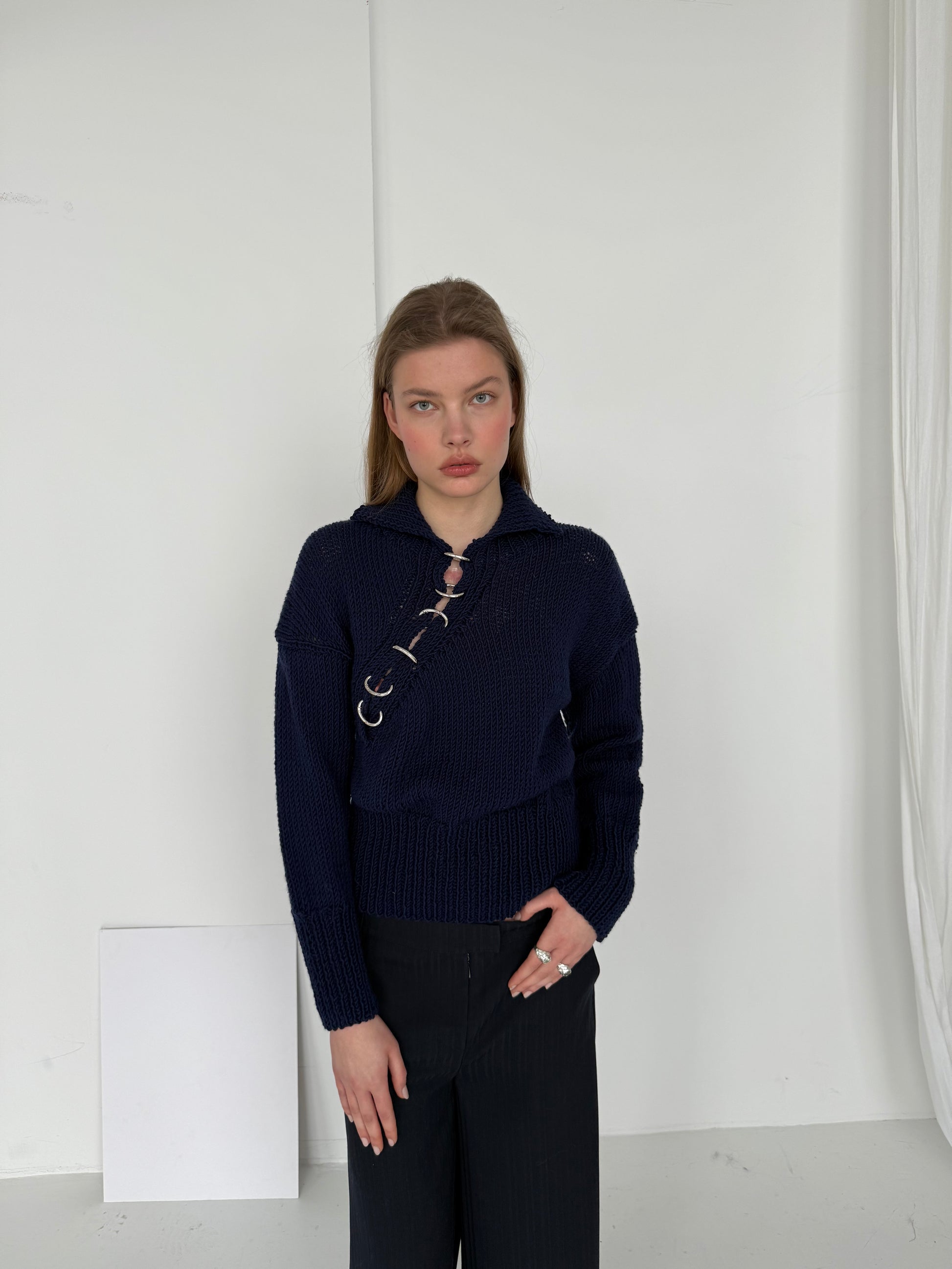 Ręcznie dziergany sweter z rozcięciem na skos, zapinany na owalne stalowe kółka. Zapięcia można dowolnie przestawiać.