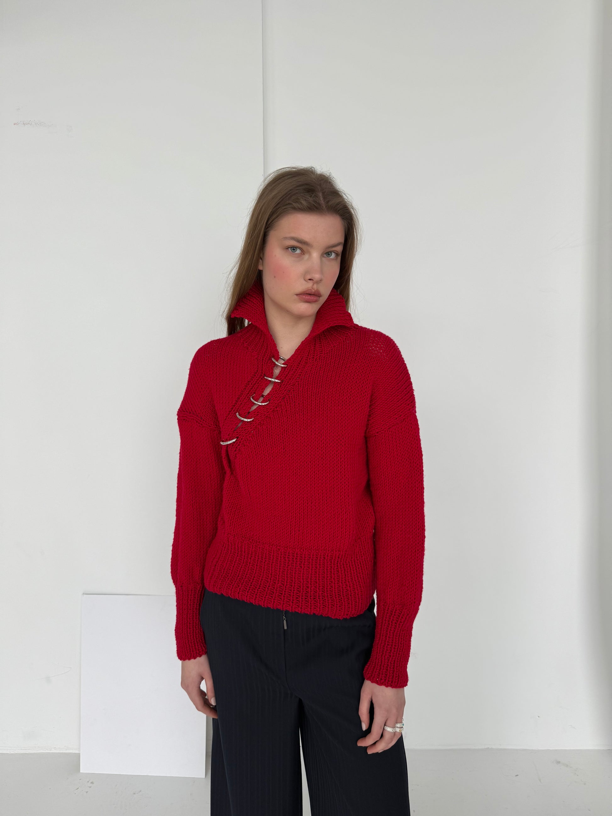 Ręcznie dziergany sweter z rozcięciem na skos, zapinany na owalne stalowe kółka. Zapięcia można dowolnie przestawiać.